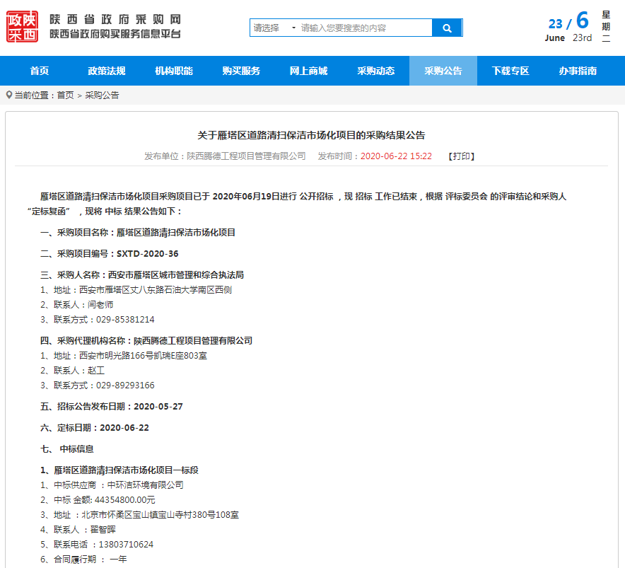 近日,中環(huán)潔中標西安市雁塔區(qū)道路清掃保潔市場化項目一標段。項目中標金額4435.5萬元,服務年限1年,服務范圍包含雁塔、等駕坡和曲江轄區(qū)城市道路,保潔總面積153.73萬㎡,綠化面積12.59萬㎡。服務內容分為道路人工清掃保潔部分,含道路清掃、綠化帶清掏撿拾、果皮箱(垃圾桶)及滅煙柱清掏擦洗、野廣告清理、道班房、保潔工具箱及休閑座椅等其他城市家具清潔;機械化作業(yè);道路掃雪除冰;極端天氣等環(huán)境衛(wèi)生應急整治及采購人要求的其他工作。